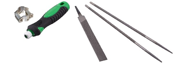Settet består av: 2 stk. kjedefiler, fil, rullemal/filadapter og filskaft