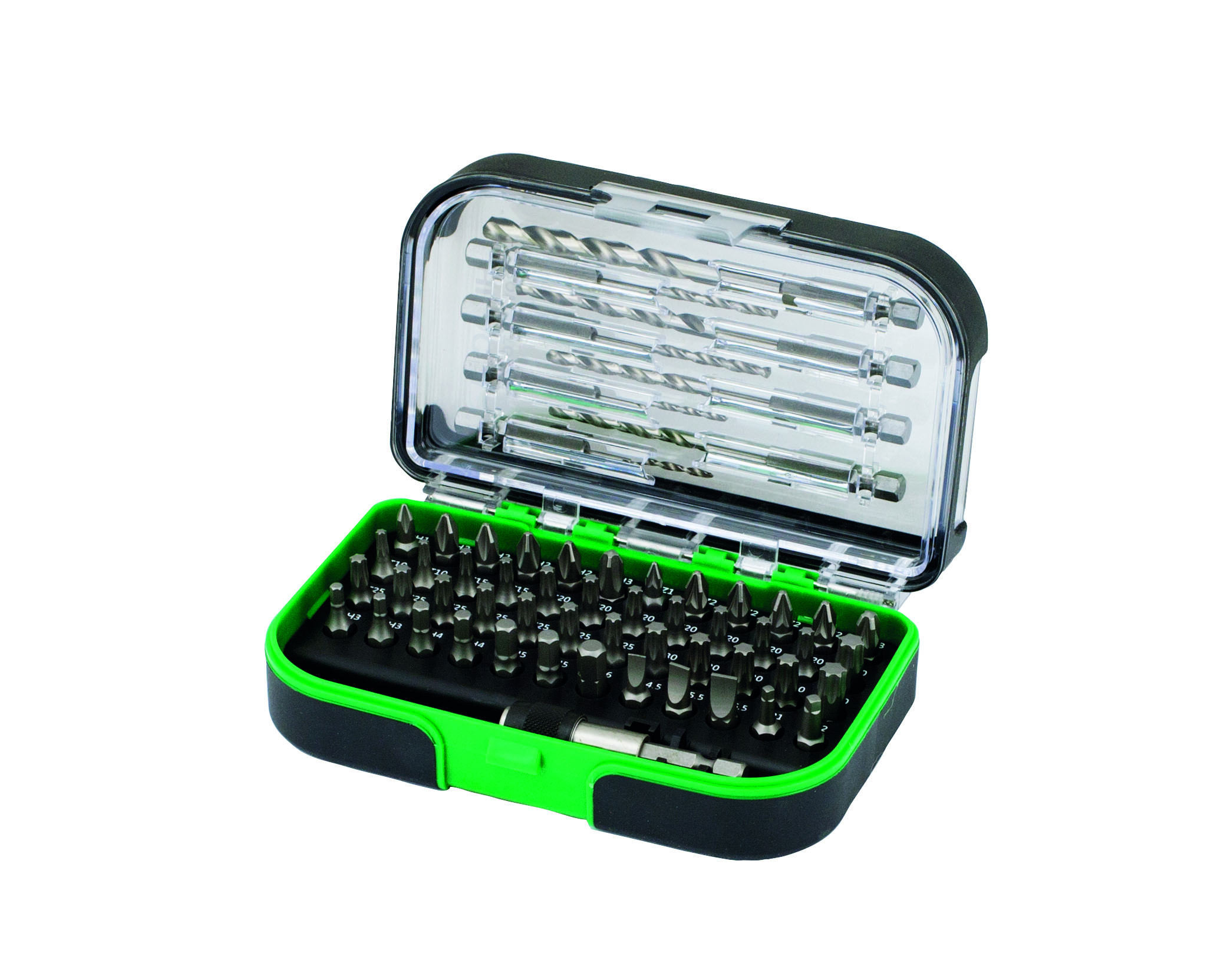 Includes: Drills: 2 (x2), 3 (x2), 4 (x2), 5, 6 / Phillips: 1, 2 (x4), 3 / Pozidrive: 1, 2 (x4), 3 / Torx: 10 (x2), 15 (x2), 20 (x7), 25 (x7), 30 (x4), 40 (x2) / Hex: 3 (x2), 4 (x2), 5 (x2), 6 / Track: 4.5, 5.5, 6.5 / Square: 1, 2 / Bit holder
