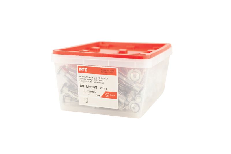 | Product no. | Maks skjær vegg gips 1 x 13 mm | Maks skjær vegg gips 2 x 13 mm | Maks uttrekk tak gips 1 x 13 mm | Maks uttrekk tak gips 2 x 13 mm | For plate- tykkelse | Bor- dim. | Anker- lengde | Skrue- dim. | Skrue- lengde |