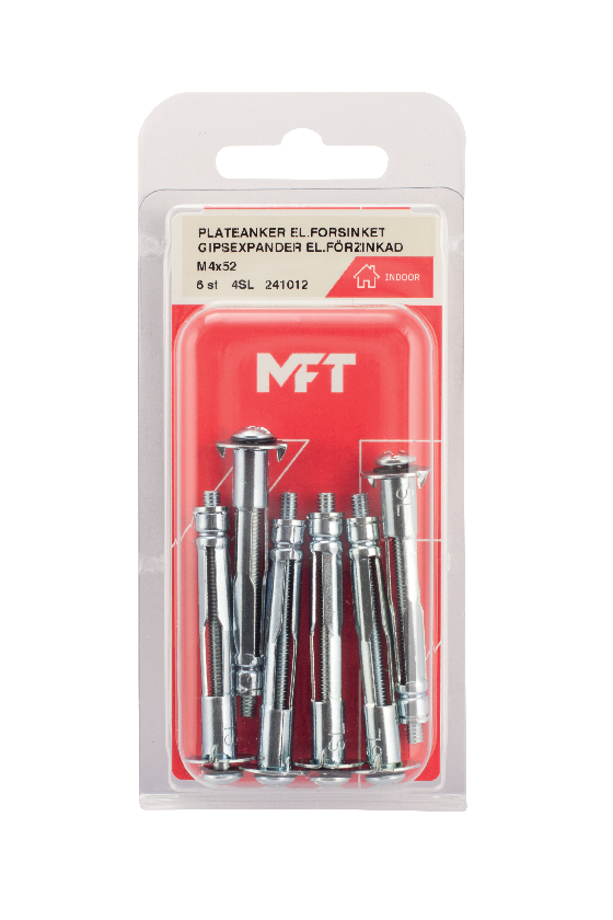 MFT Plateanker elforsinket brukes til div. tyngre oppheng opptil 20 kg i enkel gipsplate/plater i tykkelse 3-20mm. For innendørs bruk. Må formonteres. Belastning - Lett/middels