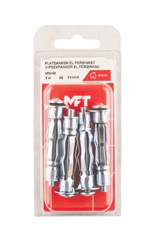 MFT Plateanker, elforsinket for enkel gipsplate. Kraftig spesialfeste for div feste i gips. Stort bruksområde. Tang anbefales for rask montering. MFT Plateanker er markedets kraftigste festemiddel for gips med høyeste uttrekksverdier.