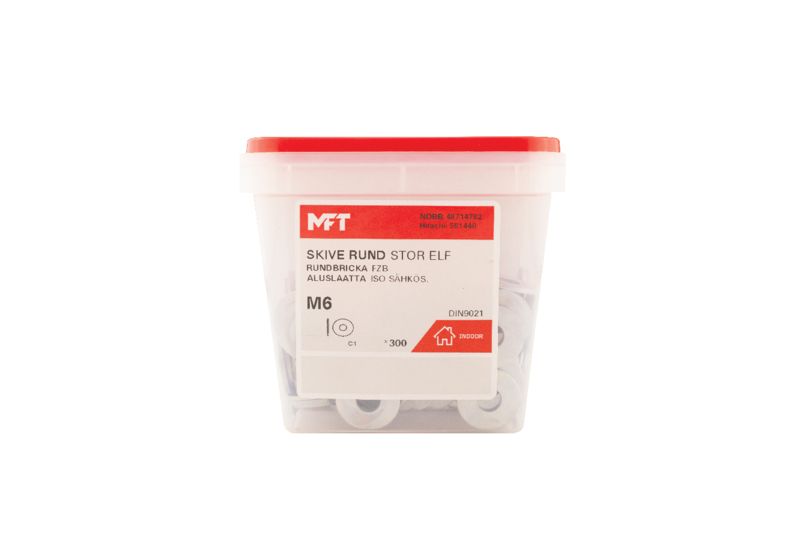 MFT Skive rund stor er produsert i henhold til DIN9021 standard i herdet karbonstål. Skiven har en elektrolytisk overflatebehandling. Korrosjonsklasse C1.